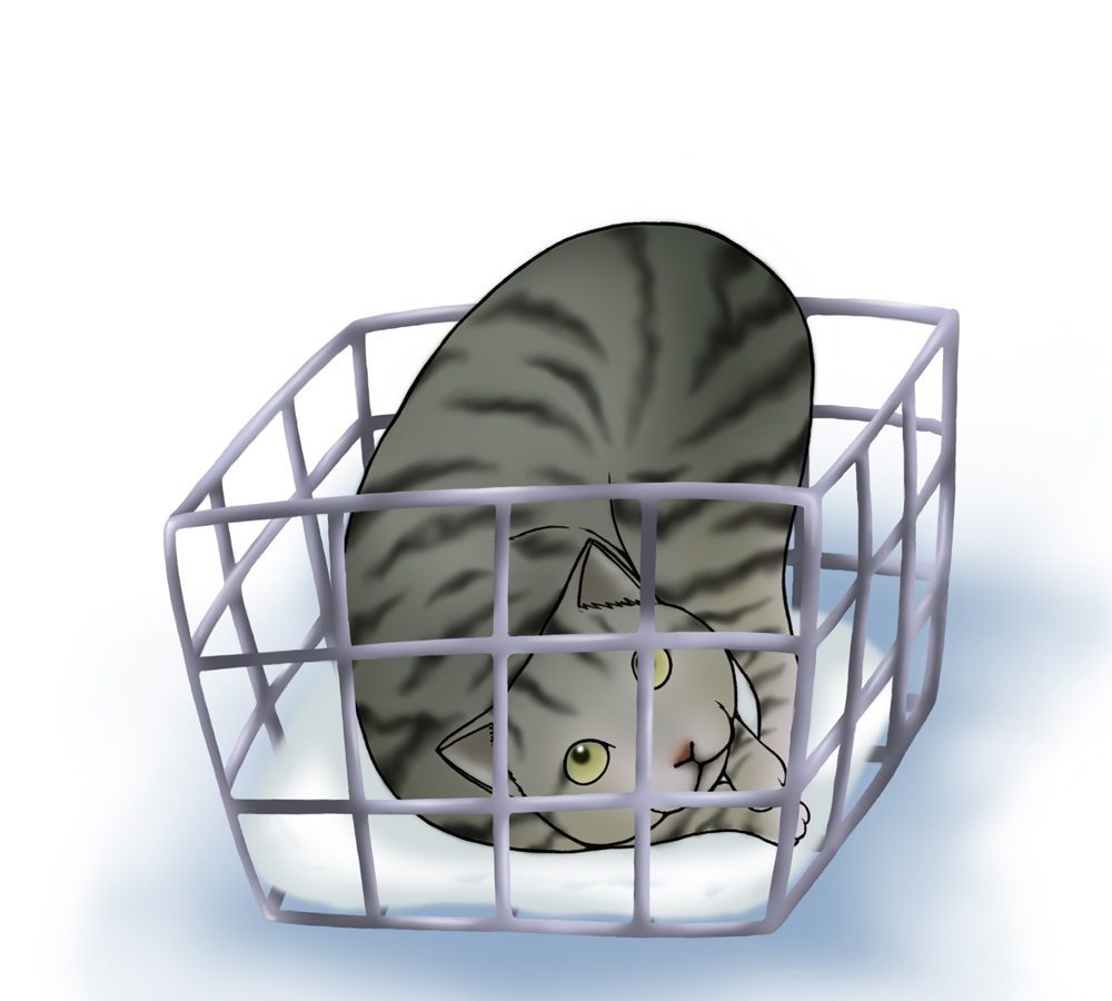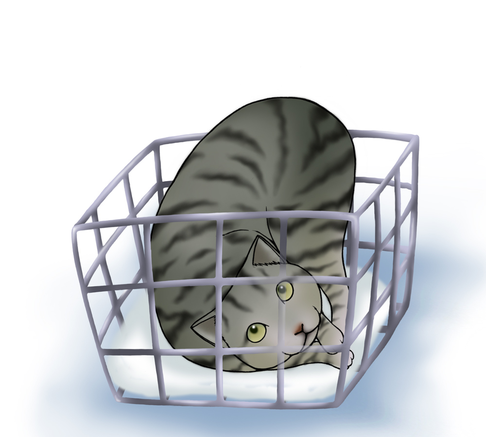 猫は「何見てんだ?」って目でこちらを見るが大人しくカゴに収まったまま。